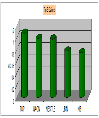 7up Plc lead the top gainers list as the stock added N1.09 or 2.80 percent to its share price to close the market at N40.00 from its opening price of N38.91. UACN Plc came second on the list, having gained N1.00 or 2.60 percent as it opened and closed the day at N38.50 and N39.50 respectively.