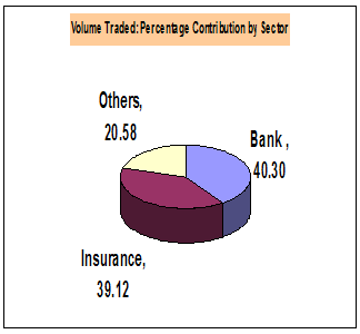 The Banking sector again emerges as the top traded Sector in volume among the 30 listed sectors in the Nigeria Stock Exchange Floor. The sector recorded 193.87 million ordinary shares traded to control largely 40.30 percent of the aggregate volume of shares traded. The Insurance sector, with 188.22 million ordinary shares, traded trailed behind the Banking sector which represented 39.12 percent of the total volume traded.