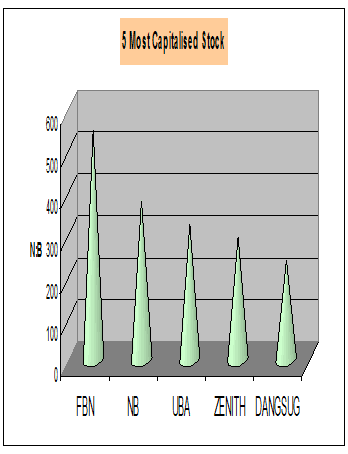 First Bank of Nigeria Plc is the highest capitalized stock at N546.43 billion today. This was followed by Nigeria Breweries Plc with 376.69 billion. United Bank for Africa Plc 323.45billion, Zenith Bank Plc with 292.87 billion and Dangote Sugar Plc N236.76 billion to maintained the third, fourth and fifth positions respectively.