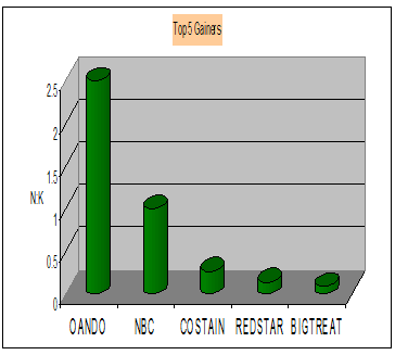 Oando Plc lead the top gainers list again as the stock added N2.50 or 2.86 percent to its share price to close the market at N90.00 from its opening price of N87.50. Nigeria Bottling Company Plc came second on the list, having gained N1.00 or 3.70 percent as it opened and closed the day at N27.00 and N28.00 respectively.