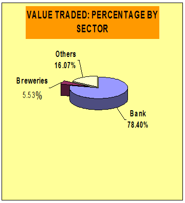 The Banking sector was the most active in value traded as the stocks worth N2,213.02 million for a 78.40 percent of the aggregate traded value for the day. The Breweries sector (N156.22 million) followed, representing 5.53 percent of the overall value traded.
