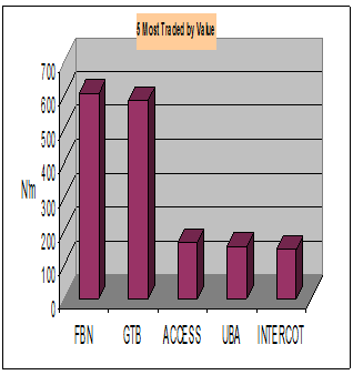 Analysis on individual company basis showed that First Bank Plc led the highest trading by value at N605.48 million today. The figure controlled 27.36 percent of total traded value in the Banking sector and 21.45 percent of the overall value traded for the whole market. Guaranty Trust Bank Plc (N586.05 million) was the second highest.