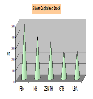 First Bank of Nigeria Plc is the highest capitalized stock at N491.05 billion today. This was followed by Nigerian Breweries Plc with N378.13 billion. Zenith Bank Plc N332.05 billion, Guaranty Plc with N254.97 billion and UBA Bank Plc N253.85 billion to maintained the third, fourth and fifth positions respectively.