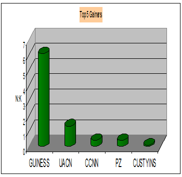 Guinness Plc lead the top gainers list again as the stock added N6.10 or 4.49 percent to its share price to close the market at N142.10 from its opening price of N136.00. UACN Plc came second on the list, having gained N1.35 or 3.83 percent as it opened and closed the day at N35.25 and N36.60 respectively.