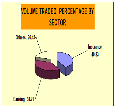 The Insurance sector emerges as the top traded Sector today in volume among the 30 listed sectors in the Nigeria Stock Exchange Floor. The sector recorded 146.89 million ordinary shares traded to control 40.83 percent of the aggregate volume of shares traded. The Banking sector, with 139.25 million ordinary shares, traded trailed behind the Insurance sector which represents 38.71 percent of the total volume traded.