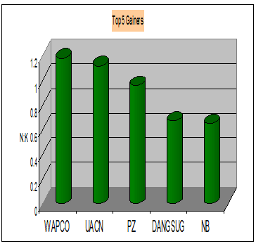 WAPCO Plc lead the top gainers list again as the stock added N1.18 or 4.63 percent to its share price to close the market at N26.68 from its opening price of N25.50. UACN Plc came second on the list, having gained N1.12 or 3.08 percent as it opened and closed the day at N36.40 and N37.52 respectively.