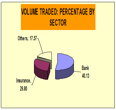 The Banking sector emerges as the top traded Sector today in volume among the 30 listed sectors in the Nigeria Stock Exchange Floor. The sector recorded 125.60 million ordinary shares traded to control 52.63 percent of the aggregate volume of shares traded. The Insurance sector, with 71.10 million ordinary shares, traded trailed behind the Insurance sector which represents 29.80 percent of the total volume traded.