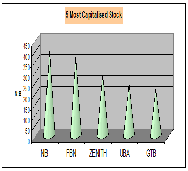 Nigeria Breweries Plc is the highest capitalized stock at N400.82billion today. This was followed by First Bank of Nigeria Plc with N372.36 billion. Zenith Bank Plc N288.35 billion, Guaranty Plc with N245.52 billion and UBA Bank Plc N218.72 billion to maintained the third, fourth and fifth positions respectively.