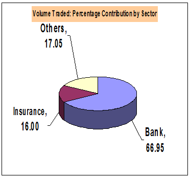 The Bank sector emerges as the top traded Sector today in volume among the 30 listed sectors in the Nigeria Stock Exchange Floor. The sector recorded 282.12 million ordinary shares traded to control 66.95 percent of the aggregate volume of shares traded. The Insurance sector, with 67.43 million ordinary shares, traded trailed behind the Insurance sector which represents 16.00 percent of the total volume traded.