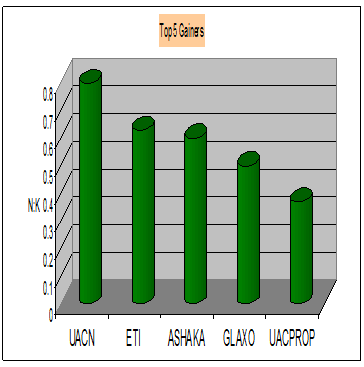 UACN Plc lead the top gainers list again as the stock added N0.80 or 2.16 percent to its share price to close the market at N37.80 from its opening price of N37.00. ETI Plc came second on the list, having gained N0.63 or 4.01 percent as it opened and closed the day at N15.70 and N16.33 respectively.