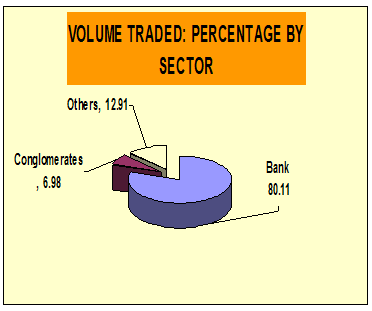 The Banking sector emerges as the top traded Sector today in volume among the 30 listed sectors in the Nigeria Stock Exchange Floor. The sector recorded 682.73 million ordinary shares traded to control 80.11 percent of the aggregate volume of shares traded. The Conglomerates sector, with 59.46 million ordinary shares, traded trailed behind the Insurance sector which represents 6.98 percent of the total volume traded.