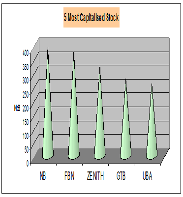 Nigeria Breweries Plc is the highest capitalized stock at N393.33 billion today. This was followed by First Bank of Nigeria Plc with N379.53 billion. Zenith Bank Plc N323.01 billion, UBA Plc with N280.14 billion and Guaranty Trust Bank Plc N262.33 billion to maintained the third, fourth and fifth positions respectively.
